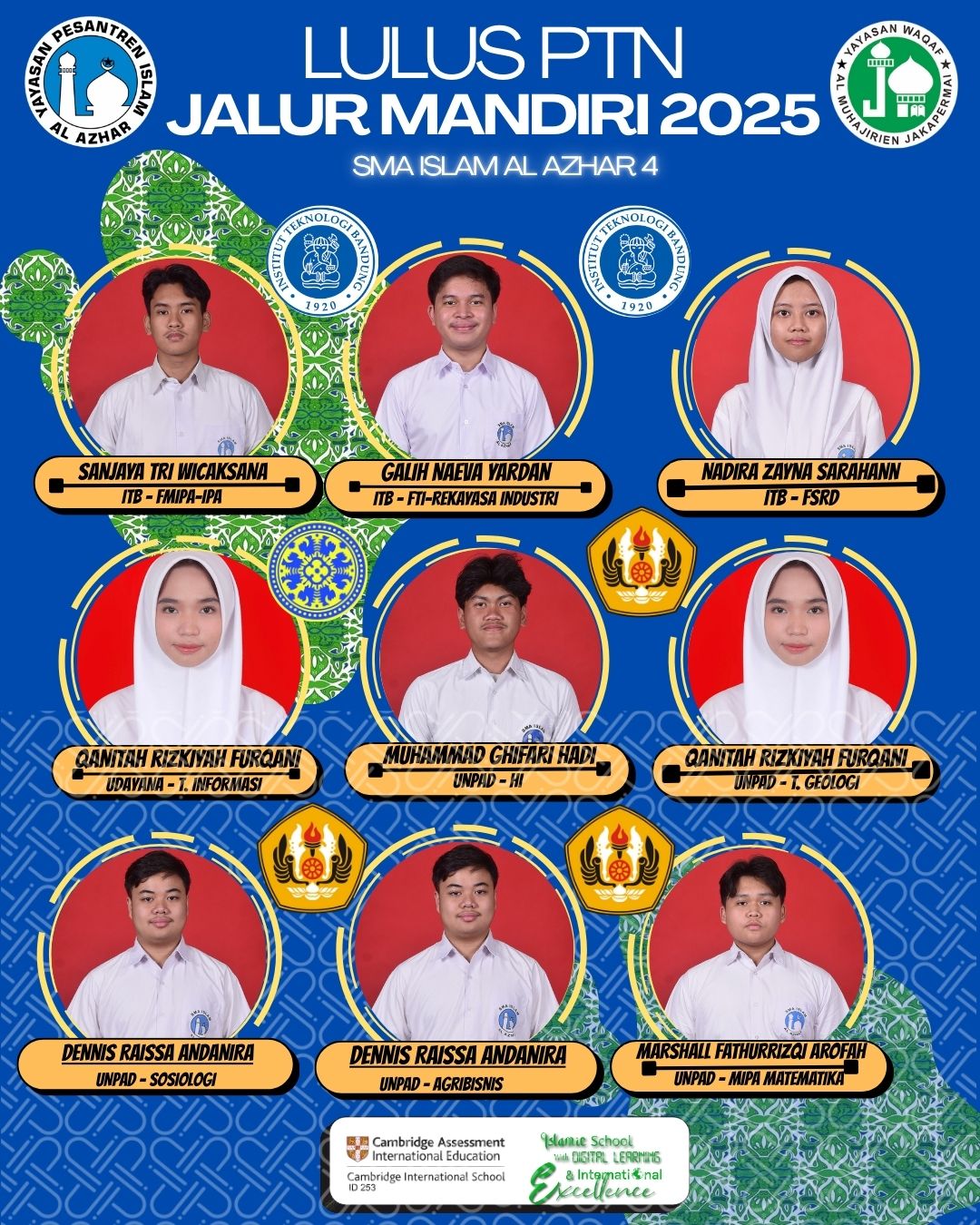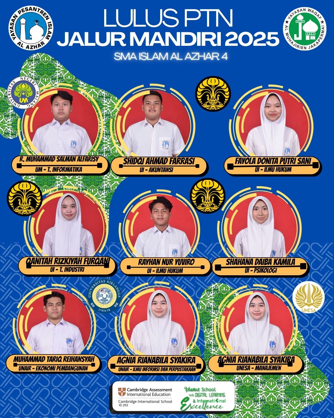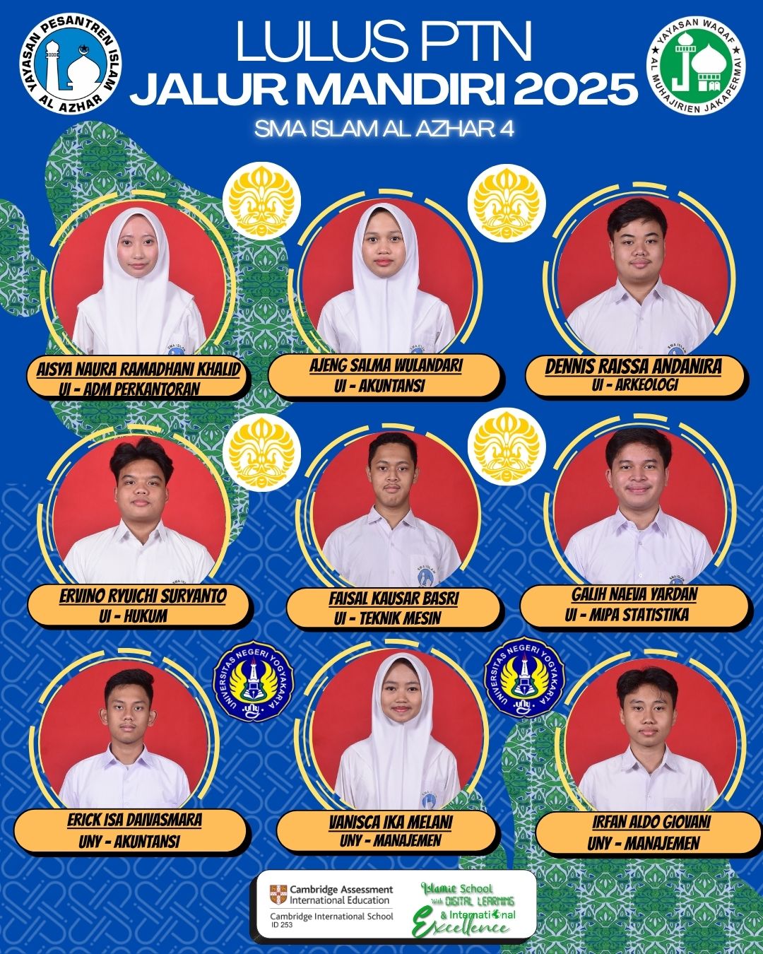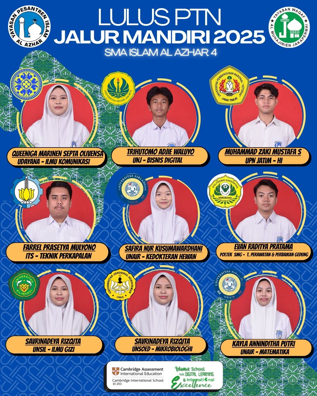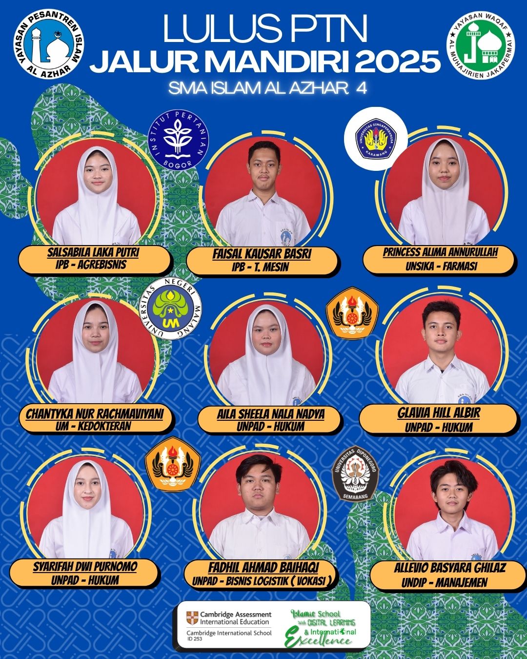 Alhamdulillah menjadi keluarga SMA Islam Al Azhar 4 merupakan suatu kebangaan dan hal yg saya syukuri. Segudang prestasi telah diraih sekolah ini, baik skala nasional maupun internasional. Selain itu, fasilitas yang ditawarkan, meningkatkan suasana belajar di kelas dan saya dibekali untuk menjadi pribadi yang unggul dalam akhlak, prestasi, serta berwawasan global, yang nilai-nilainya akan selalu saya tanamkan.