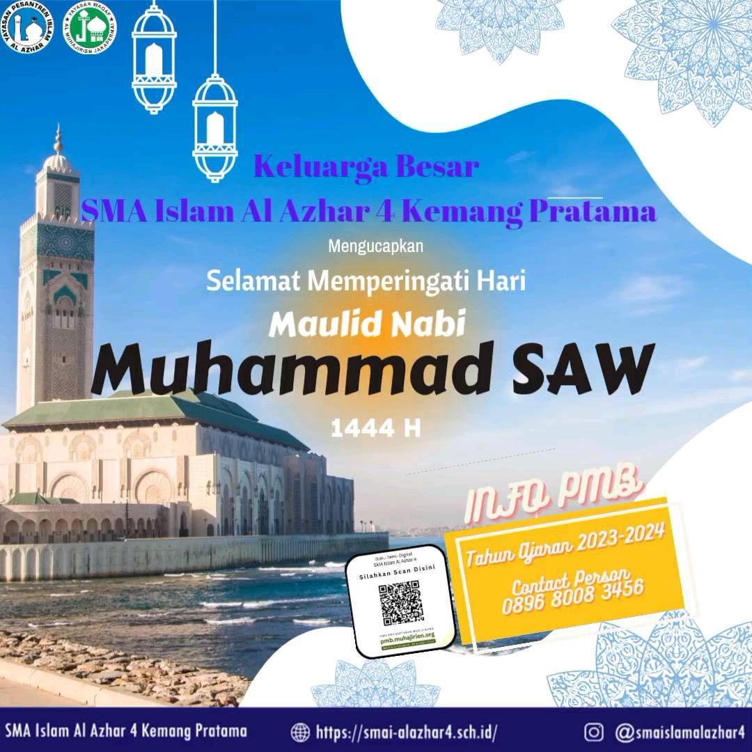 Keluarga Besar SMA Islam Al Azhar 4 Kemang Pratama mengucapkan“Selamat Memperingati Hari Maulid Nabi Muhammad SAW” 12 Rabiul Awal 1444 H/ 2022 —————————Segera di buka PMB Tahun Ajaran 2023 – 2024SMA Islam Al Azhar 4 Kemang PratamaKunjungi Link dan Website Resmi kami di :pmb.muhajirien.orghttp://smaia4.sch.id ๐๐ฃ : ๐ฌ๐ด๐ต๐ฒ๐ด๐ฌ๐ฌ๐ด๐ฏ๐ฐ๐ฑ๐ฒโ๏ธ : ๐ฌ๐ฎ๐ญ-๐ด๐ฎ๐ฎ๐ด๐ฑ๐ด๐ฌ @ywalmuhajirien@ypi_alazhar@kbtkia11_kp@tkia8jp@smpia8@smpia6@smpia9bks@sdia9kp@sdi_alazhar6@smaislamalazhar4@smpia44@smaialzhar18grandwisata@mialmuhajirien@jamiyyah_tkia_11@jamiyyahtkia8jp@jamiyyah.sdialazhar6jp@jamiyyah.sdiaalazhar9@jamiyyah_6jp@jamiyyahsmpialazhar9kp@jamiyyah.smpia8kp@jamiyyahsmpia44@jamiyyahsmaialazhar4@masjidalazharjakapermai #pmb_alazhar#pendaftaranmuridbaru#beasiswa#ywalmuhajiiren#ypialazhar#alazhar#alazharbekasi#bekasi#sekolahislam#bekasihits#sekolahislamfavorit