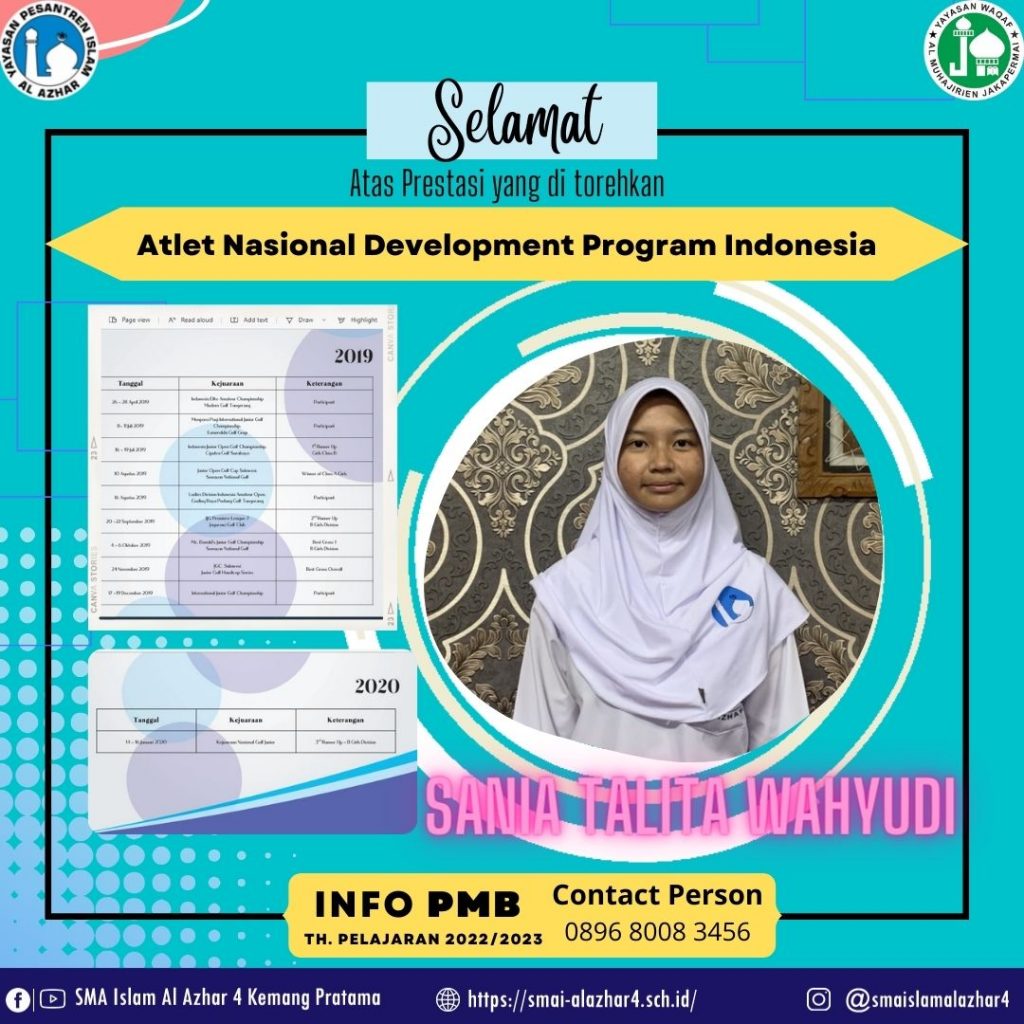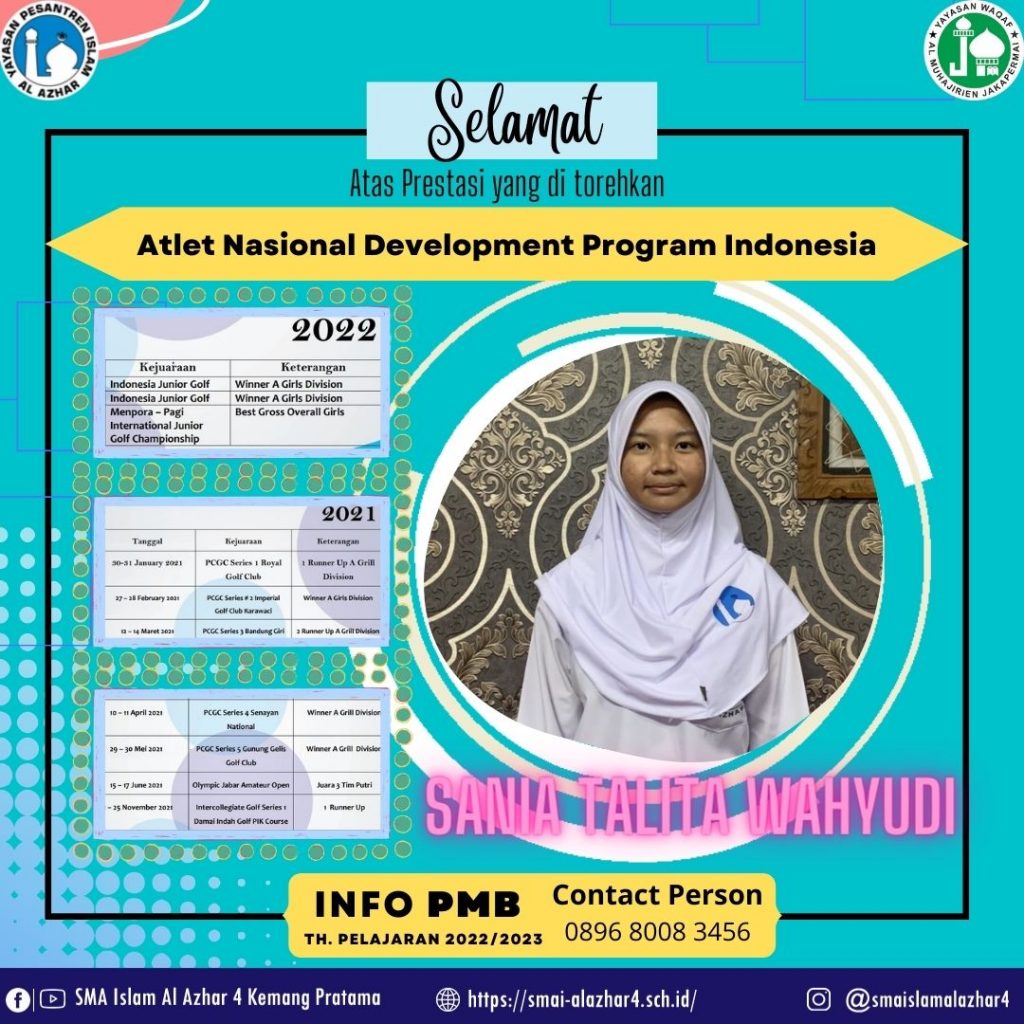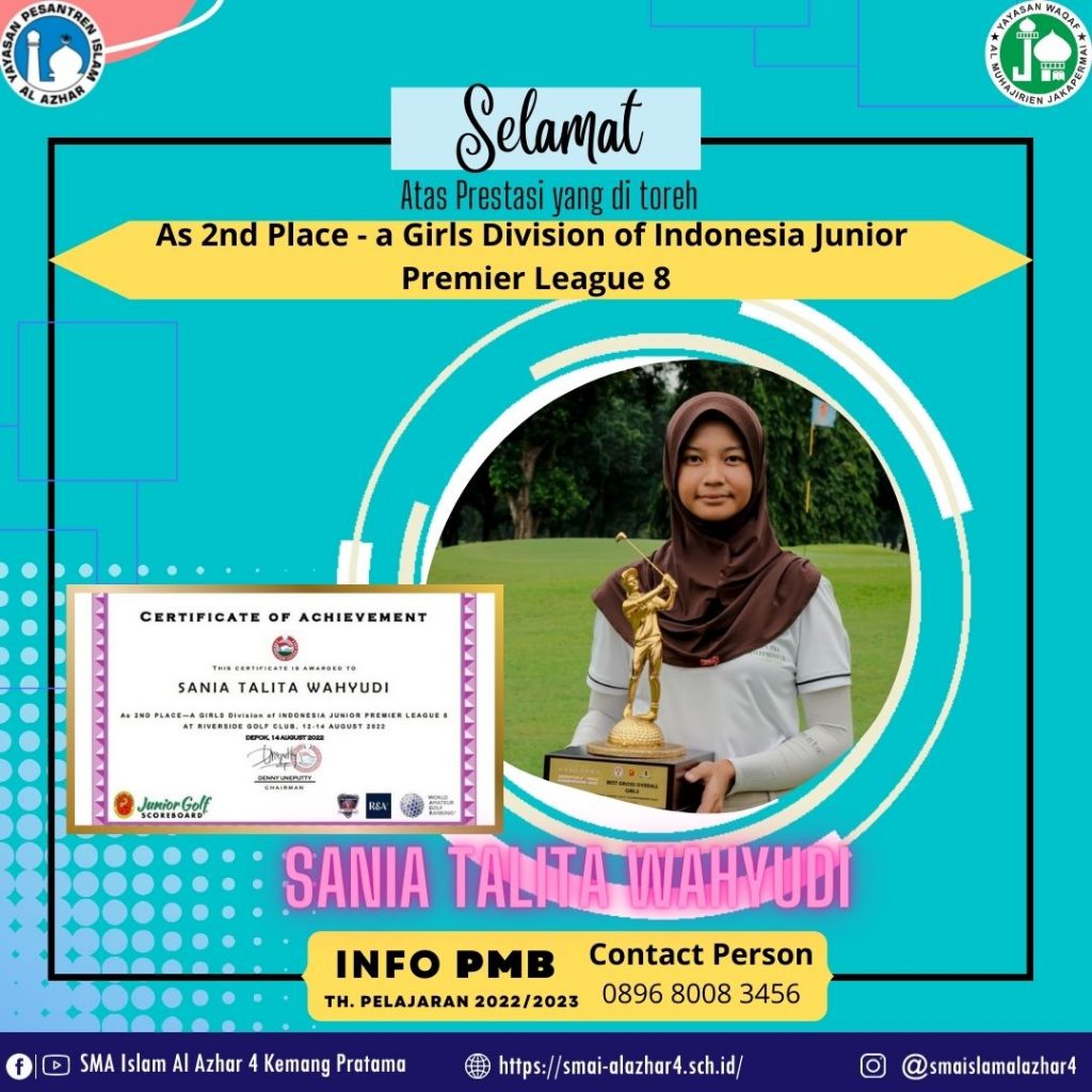 Keluarga Besar SMA Islam Al Azhar 4 Kemang Pratama mengucapkan Selamat atas prestasi yang diraih Ananda SANIA TALITA WAHYUDI dalam kejuaraan “A Girls Divisions Of Indonesia Junior Premier League 8” peraih Juara 2. Semoga selalu dapat menorehkan prestasi yang gemilang di masa yang akan datang dan dapat mengharumkan almamater SMA Islam Al Azhar 4 Kemang Pratama dan dapat melangkah ke dalam kejuaraan International.