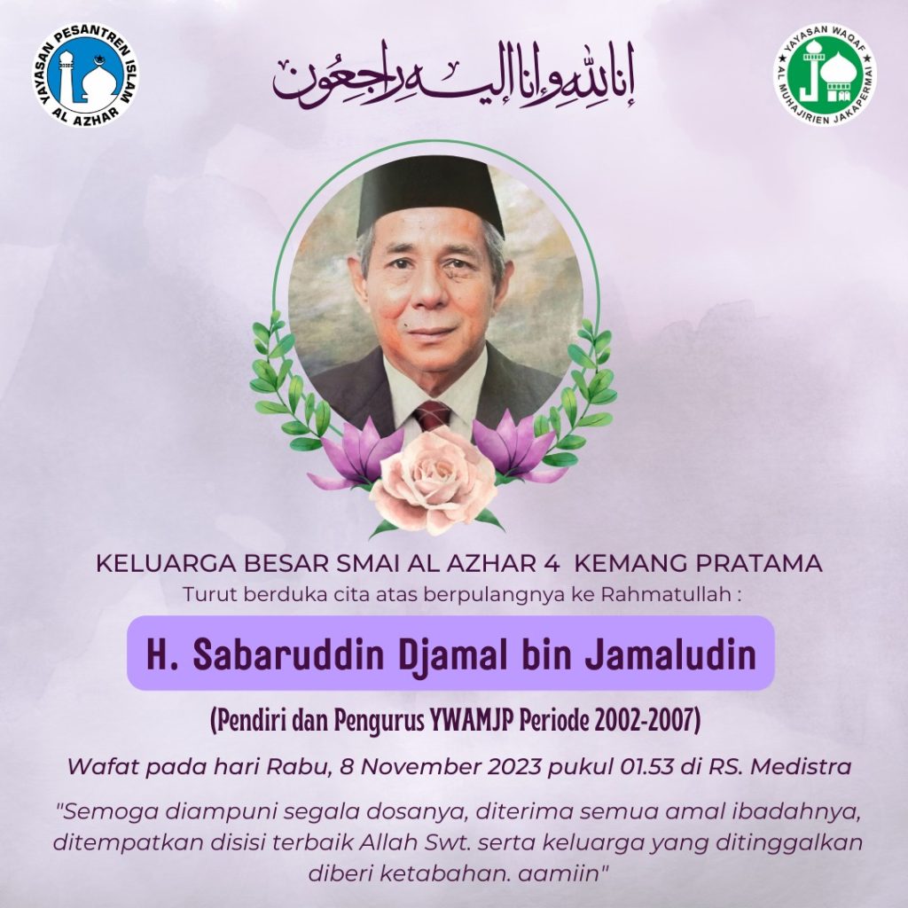 Innalillahi wa inna ilaihi rojiun. Keluarga Besar SMA Islam Al Azhar 4 Kemang Pratama turut berduka cita atas berpulangnya ke rahmatullah Bapak : Sabaruddin Djamal bin Jamaludin (Pendiri dan Pengurus YWAMJP periode 2002-2007, Pengelola Kampus Al Azhar Jakapermai, Kemang Pratama, Grandwisata) Wafat pada hari Rabu, 8 November 2023 pukul 01.53 di RS. Medistra Semoga diampuni segala dosanya, diterima semua amal ibadahnya dan ditempatkan di sisi terbaik Allah Swt. Semoga keluarga yang ditinggalkan diberikan kesabaran dan keikhlasan. aamiin